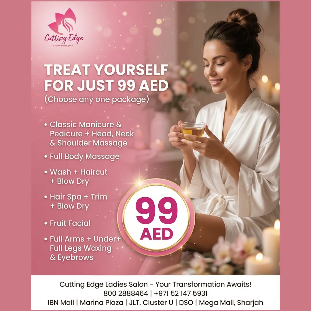 Treat yourself to premium beauty for less with your choice of any one elite package for just 99 AED.✨ Choose from a Full Body Massage, a Fruit Facial, or a Mani-Pedi combo with a head and neck massage. Prefer hair care? Opt for a Hair Spa, Trim, and Blow Dry or a fresh Wash and Haircut. Your transformation awaits at Cutting Edge Ladies Salon—click below to book your 99 AED✨ luxury treat.