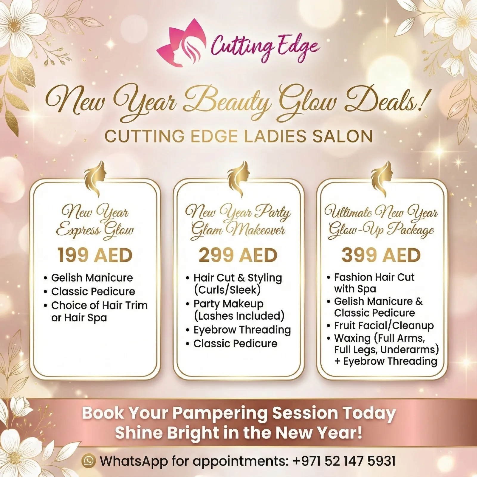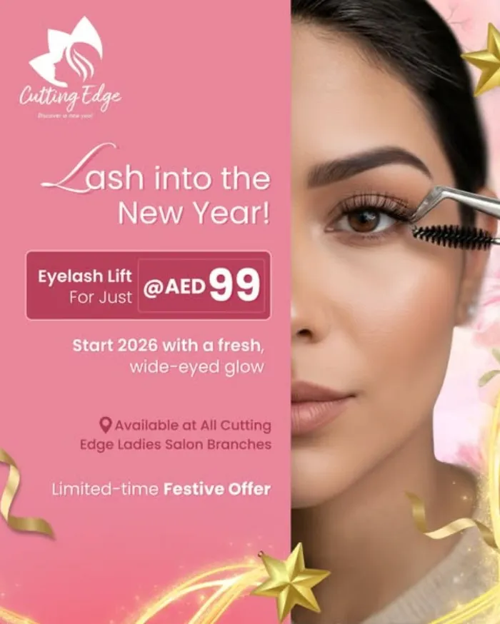 Welcome the New Year with exclusive beauty glow packages designed to refresh your look and boost your confidence. Choose the New Year Express Glow for 199 AED ✨ with a Gelish manicure, classic pedicure, and your choice of a hair trim or hair spa, or go for the New Year Party Glam Makeover for 299 AED ✨ with haircut and styling, party makeup with lashes, eyebrow threading, and a classic pedicure. For the ultimate pampering experience, select the Ultimate New Year Glow-Up Package for 399 AED ✨ featuring a fashion haircut with spa, Gelish manicure and classic pedicure.
