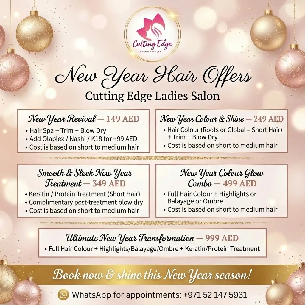 Arrive in the New Year with exclusive hair care offers designed to refresh your look and boost your confidence. Choose the New Year Revival for 149 AED ✨ with a hair spa, trim, and blow dry, or upgrade with Olaplex, Nashi, or K18 for an additional 99 AED.✨ Go for the New Year Colour and Shine for 249 AED ✨ with hair colour, trim, and blow dry, or select the Smooth and Sleek New Year Treatment for 349 AED ✨featuring keratin or protein treatment with a complimentary blow dry. For a complete transformation, pick the Ultimate New Year Transformation for 999 AED ✨ with full hair colour, highlights, balayage or ombre.